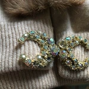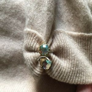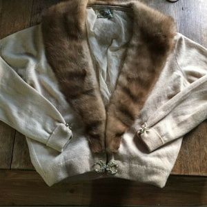 vintage cashmere sweater by De Loux 100% 2 ply imported cashmere with detachable fur collar....appears to be real fur of some type....rhinestone cuff buttons and rhinestone moon clasp on front...it is missing a few rhinestones....lace and sheer material for lining....there is a stain on the sheer part of the lining but no major damage found looks to be in good condition with some piling but please see pictures ..marked size 40 pit to pit 20"