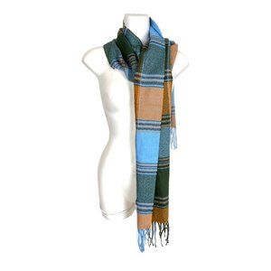 100% Cashmere made in Scotland plaid scarf wrap Fringe hem blue Orange Green