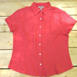 Coral or salmon pink top from "i.e. Petite." Size 8 Petite (Medium). Eyelet lace embroidery makes a star or flower pattern. 100% cotton fabric. Tailored button-up style with collar, short sleeves, and a curved hem. Front, back, and bust darts for shaping. Shell buttons.