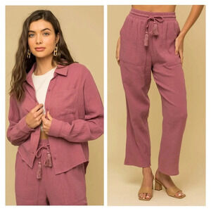100% Cotton Boho Button Down Shirt & Pants Set(Mauve)