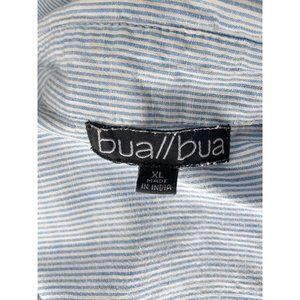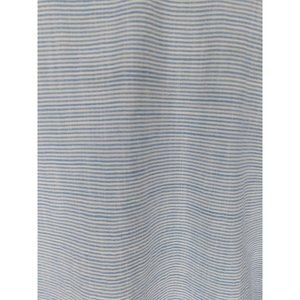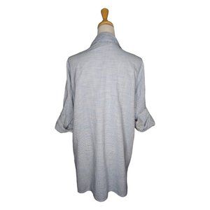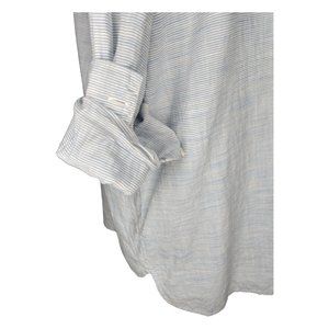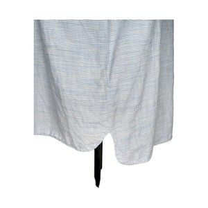 Blue and white horizontal stripe 100% cotton fabric. Lightweight relaxed fit popover collared shirt with V-Neck. Slightly longer hem in back. Long sleeve. Perfect beach coverup or warm weather everyday wear.