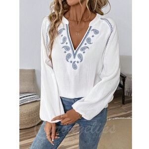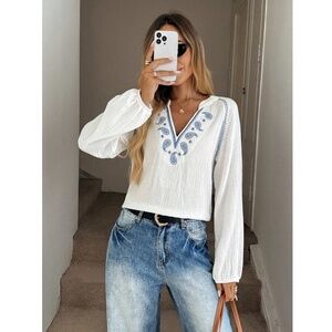 100% Cotton Embroidered White Long Sleeve Shirt V-Neck