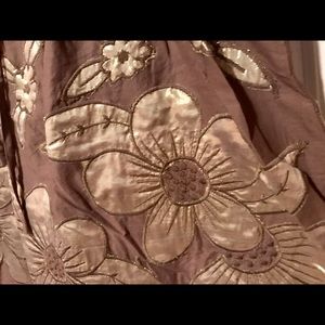 Like new, adorable S-M tan tunic adorned with beautifully sewn gold flowers. Would look great with leggings or skinny jeans/capris. 3/4 length flared sleeves. 100% cotton. Made in India. Machine wash. Could fit small with tie below bust.