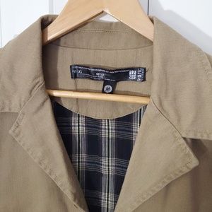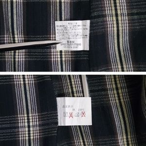 Blazer style collar but a somewhat rugged utilitarian look. No taper at the waist, it's a straight cut. Fully lined with navy blue plaid. 3 outside pockets, none inside. 100% Cotton. Care tag in Japanese, but it's Made in Hong Kong. Do not tumble dry.