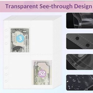EASY TO CARRY AND USE:The cash binder is the right size for you to take it anywhere. The transparent inner volume consists of 25 pages. There are 4 card slots on theof each page, a total of 100 card slots. A rich combination of accessories allows you to complete records anytime, anywhere. This is a great budget binder.