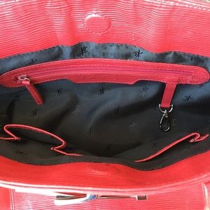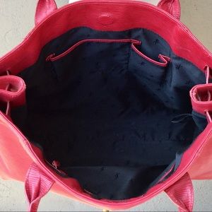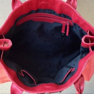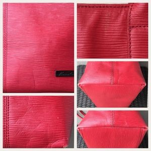 This classic red Tote is 100% genuine leather and features magnetic closure, one inside zip pocket with key strap, two open pockets and belt that can be adjusted for a wider opening. This bag is pre-loved and does shown some sign of wear. Please see pics for measurements and condition.
