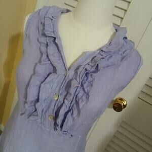 100% Italian Linen Periwinkle Sleeveless Ruffled-Button-Up-V Neck Pockets collar