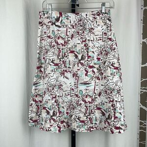 Additional Details: Unlined, outdoor floral and bridge scene print, hidden side zip entry, no pockets.