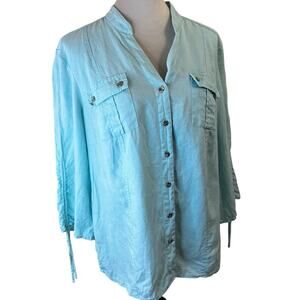 Stay cool and stylish in this lightweight aqua green blue 100% linen blouse by JM Collection. This button-down top features a flattering mandarin collar, roll-tab sleeves with ruched drawstring detail, and dual chest pockets for a touch of utility flair. Perfect for casual spring and summer wear, it’s both breathable and versatile.