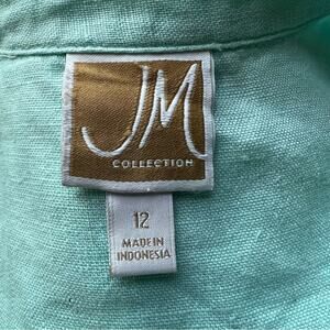100% Linen Aqua Green JM Collection V-neck Button Up Blouse, 3/4 Sleeves Size 12