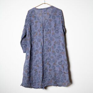Lightweight, breezy, block-printed, 100% linen. Single button at the front, otherwise fully open. Would make a great beach cover-up! Marked a Large but the sleeves are a bit slimmer - I would call this more of a Medium.