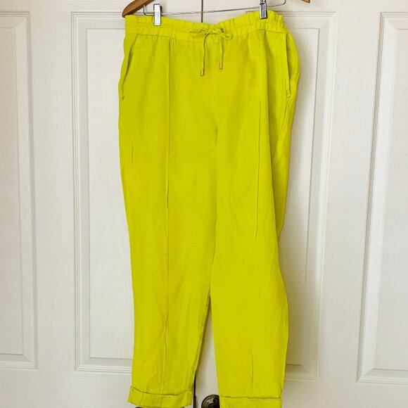 !00% lime/ chartreuse green relax leg tapered at the ankle.Drawstring and elastice waist tie, two front slash pockets and a sewn down crease effect in the front. Loose, relaxed fit for the summer, vacations, cruises and anywhere you want to look elegant and yet relaxed.
