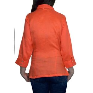100% Linen Orange Women's Button Down Collared Shirt with Embroidered Chest: Medium:(add about 1.5" for every size up) Neck:18" Sleeve:17" Back:16" Bust:41" Length:25" Please note: The shirt has been heavily starched, which might result in a rough stuff quality before first wash.