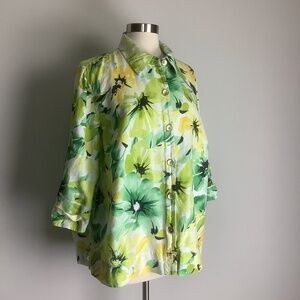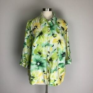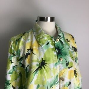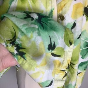 Jones New York 100% Linen Floral Button Down Blouse. Great pre-owned condition, no visible flaws. Flaw: Missing size tag, please refer to below measurements