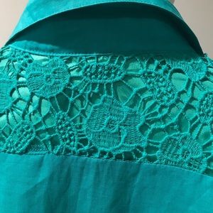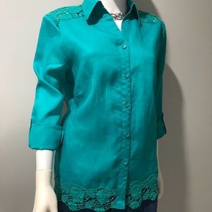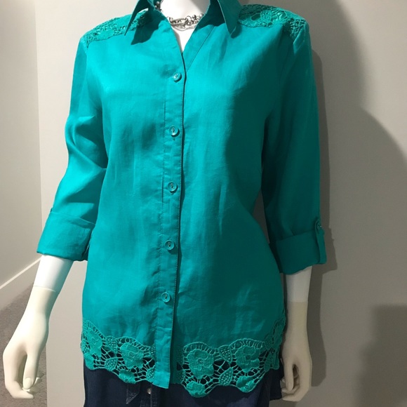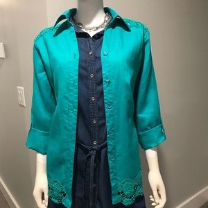Striking turquoise 100% linen jacket with satin - like lining. Floral crochet lace along the shoulders, hem and back of the neck. Loops with button closure stays at each sleeve if you choose to roll up the sleeves. Minimal light padding at the shoulders for shaping. Very roomy with 44” bust, 26” length. Size medium. Looks great fully buttoned up as pictured.