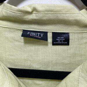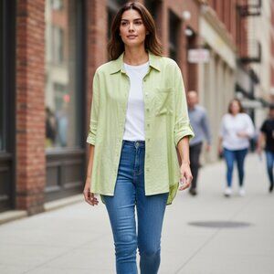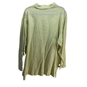 This 100% Linen Top Tunic Button Up Shirt in size 2X features a solid green lime color with Mother Pearl buttons for a classic and preppy look. The long sleeve, collared neckline, and button closure make it perfect for travel and casual occasions. Made from lightweight and breathable linen fabric, this shirt is suitable for all seasons, especially summer, fall, and spring. With a relaxed fit and a plus size design, this shirt from Finity Studio combines comfort and style for the modern woman.