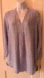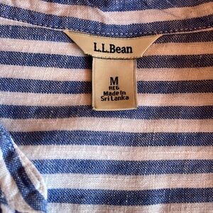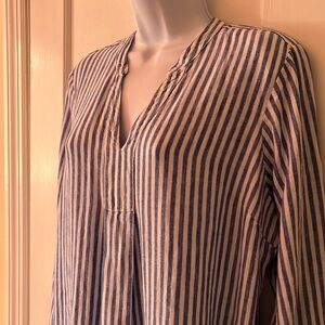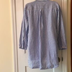100% Linen Tunic Top Women Medium Blue White Striped V-Neck Long Coastal Beachy