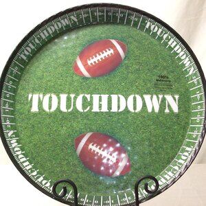13.5 inch round football serving platter. Break and scratch resistant. Dishwasher safe (top rack only) BPA free. *Not microwave safe*