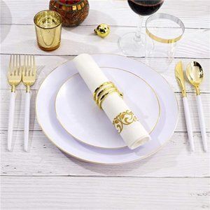 🧿Premium Set of Dinnerware: Our gold trim plastic plates are excellent options that you will get everything you need in this kit - plates (100 10.25inch dinner plates), which are perfect for events that you need to feel fancy or special.