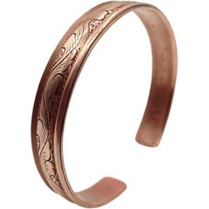 Features: Handmade from high-gauge pure copper, this unpolished and uncoated bracelet has a beautifully carved Tibetan-inspired design. Adjustable to comfortably fit any wrist, with a sleek, solid band feel. Perfect for those who love spiritual or artisan-crafted jewelry.