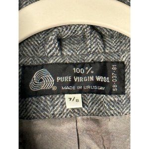 This versatile gray career wear blazer jacket for women is made of 100% pure virgin wool. With a button-up front and size 7/8, it is perfect for a professional and stylish look.