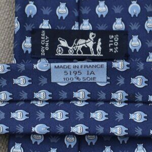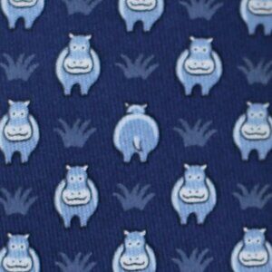 100% REAL HERMES TIE ~ BLUE w FUN LIGHT BLUE AFRICAN HIPPOS HIDING IN THE GRASS