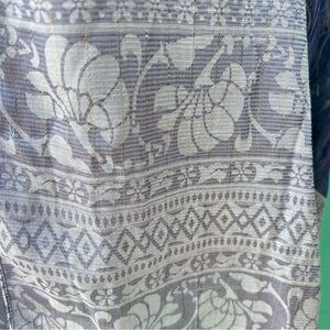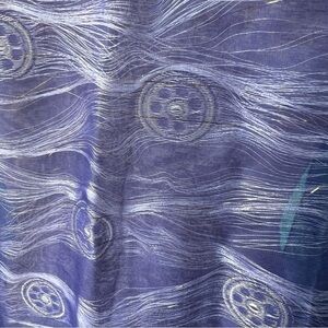 Gorgeous Sheer double layer peacock like design on body and lighter blue floral and geometric design on ends with gold thread. Blue fringe on bottom.