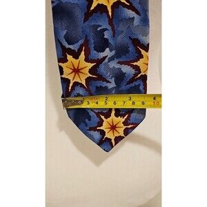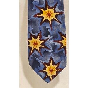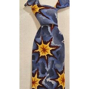 This 100% silk Grateful Dead Blue "Dark Star Second Set" tie features a geometric star pattern in classic blue color. The tie is handmade in the United States and is designed with a logo accent, making it a unique and stylish accessory for men. With a classic size and width, this designer tie is adjustable and adds a touch of vintage-inspired flair to any outfit.