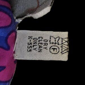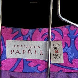 This is an Adrianna Papéll short sleeved blouse and short skirt in a fun lilac/blue and hot pink pattern. This outfit is a size 14 and in great condition. The blouse has padded shoulders and the skirt has an elastic waistband. This designer, Adrianna Papéll, is well known for the dresses and gowns she creates.