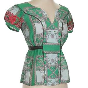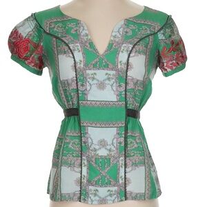 100% Silk, Anthropologie embroidered Blouse Green and Red Women's Top