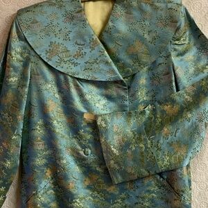 Beautiful, shimmering, heavy 100% silk women’s jacket. Made in post war Japan.My uncle was stationed in Tokyo and sent many lovely items home to my aunt, but she never wore this. It is a light aqua brocade lined in rich gold-colored silk. The round collar extends over the shoulders and around the back. The front is double breasted with four self-covered buttons and two slit pockets. The bottom is scalloped in front and is cut in a smooth arc in the back.