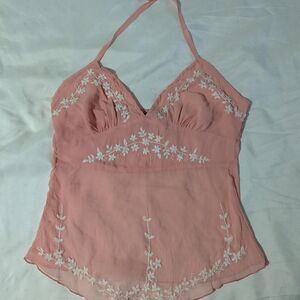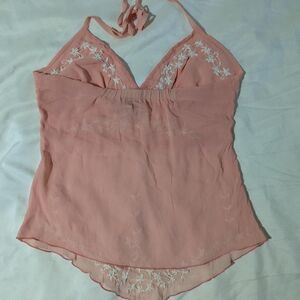 100% Silk Chiffon Women's Medium Pink Embroidered Halter Top