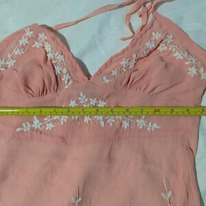 100% silk! Gorgeous 100% chiffon silk vintage Y2K Pink babydoll halter top with exquisite white floral embroidery and sequins. Material is sheer. Most chiffon these days is made from cheaper materials like polyester. Real silk chiffon clothing sells for hundreds. Like new condition.