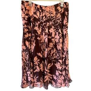 100% Silk Floral A-Line Skirt - Brown & Coral - Size 12