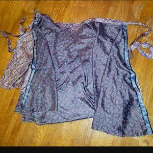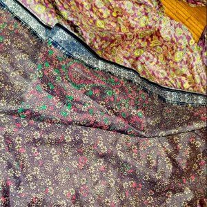 Timeless bohemian India 100% silk slinking wrap-around midi skirt, or dress, tiny floral print in tones of muted mauve, pink, gray and green, ruffled and layered. Versatilly chic with your boots and a fall sweater, or summery with sandals and a tank.