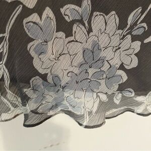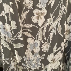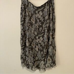 100% silk skirt. Green floral pattern. Fully lined. Flouncy hem. Side zip. Elastic panels at waist.