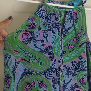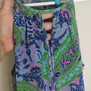 NWOT oversized 100% silk high low popover blouse in a whimsy fairy print. keyhole closure on back.