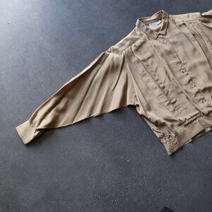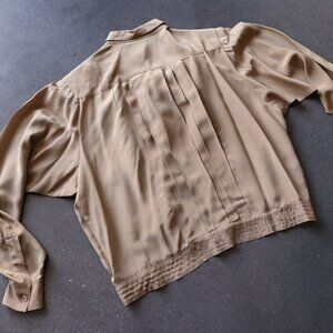 A stunning piece by a timeless brand, Liz Claiborne. This luxurious 100% silk fabric is to die for. An on-trend mocha mouse color and an unusual cut for a blouse. It has a boxy shape with pleated detail and a banded bottom hem with batwing-style sleeves. Perfect for adding an unexpected touch to an otherwise staple capsule wardrobe piece.