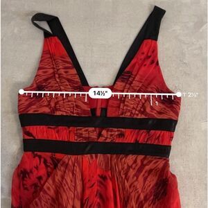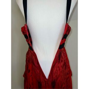 100% Silk Low Cut Red Gown Midi Dress Ruffle Hem Women’s XS. See pics for measurements. Plunging neckline, zip back.
