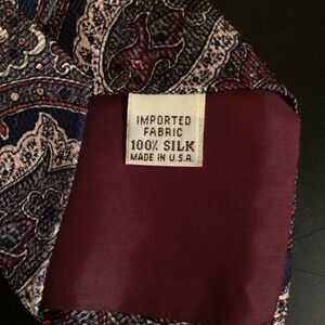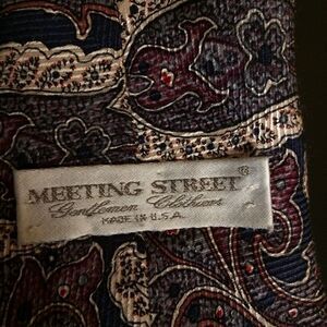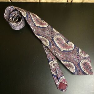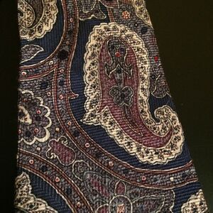 EUC 100% Silk Meeting Street tie with a ribbed texture woven into the silk. Paisley print in navy base with cream, gray and wine details.