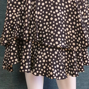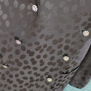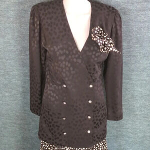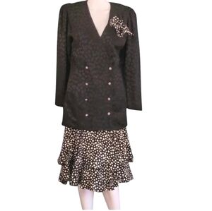 Polka dot tiered black and white ruffle skirt with long black shoulder padded jacket that has polka dots in the texture. Pocket cloth matches skirt
