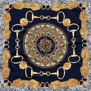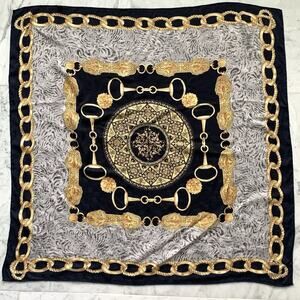 100% Silk Scarf 33" Square Navy Blue Gold Made in Italy Chain Link Tiger EUC