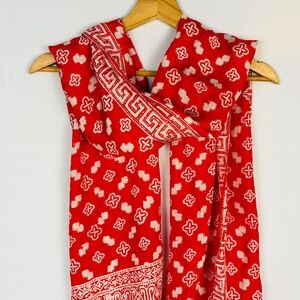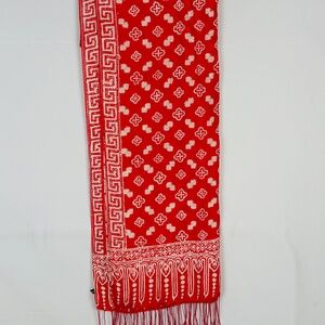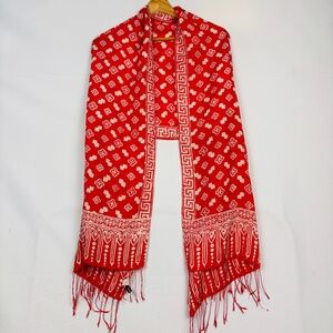 This exquisite silk scarf showcases an intricate batik print in red and white hues. Crafted from luxurious silk, it features a delicate fringe for added elegance. Its vibrant design makes it a stylish addition to any wardrobe, offering a touch of cultural artistry and sophistication.