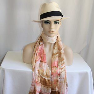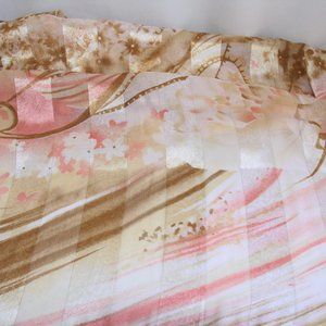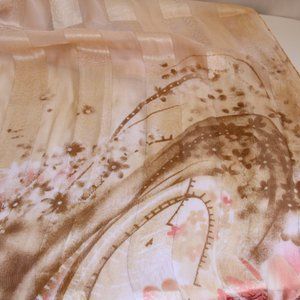 100% Silk Scarf/Wrap. Gorgeous Combination of Silk Weaves: Chiffon (Semi-Sheer) and Charmeuse (Shimmery Satin Silk) Make This Scarf/Wrap So Luxurious. The 2-Different Weaves Are Alternating Creating a Sheer and Opaque Texture. Beautiful Combination of Colors: Gold, Peach, Cream, Bronze, Coral, and Gold Metallic Threads. Artistic Pattern of Swirls, Flowers and Leaves. Size 68” x 22”. 100% Silk and S & S Signature Logos. This Luxurious Scarf Has a Sensuous Feel and Can Grace Your Shoulders to Take Away a Chill, Add Some Fashionable Style to Your Look Draped or Tied a Variety of Ways. Weight 1.83oz. Smoke/Pet Free. See Our Outstanding Customer Reviews and Buy with Confidence!