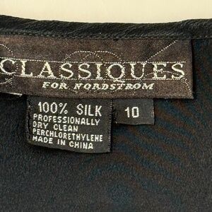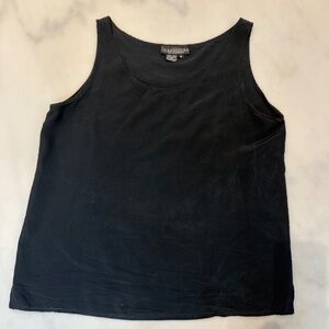 Women’s Black tank-style sleeveless shirt, 100% Silk, Classique by Nordstrom, Siz 10 X 18” long collar to hem. Bra securing snap tabs at shoulder, loose breathable, fully lined interior, worn slightly baggy style, in very good condition, wear it dressy or casual, dry clean