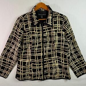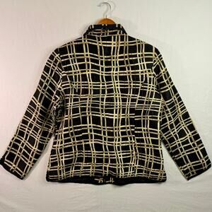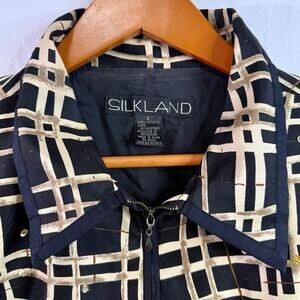 Elevate your wardrobe with this stunning Silkland 100% silk blouse-style jacket, featuring a bold black and beige abstract grid print accented with subtle gold embellishments. A chic zip-front design, collared neckline, and lightly structured silhouette give it a polished, elevated look perfect for evenings out, holiday events, office wear, or dressy casual outfits. A gorgeous statement piece with a timeless, artistic feel.