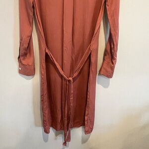 This Theory long-sleeve shirtdress is crafted of pure silk. An adjustable tie-front