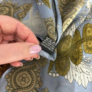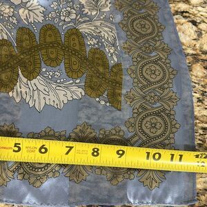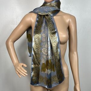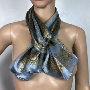 Add a touch of elegance to your outfit with this stunning blue, white and gold scarf. Perfect for any occasion