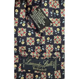 Beautiful 100% Silk Necktie by Leonardo Strelli for Tie Rack. Navy blue background with red/yellow print accents.
