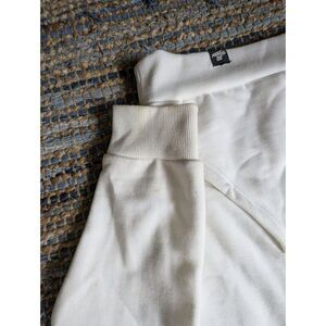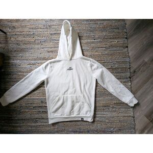 This 100 Thieves Hoodie is a white, solid-colored pullover featuring an embroidered center logo, giving it a grunge style. Made from a thick cotton blend fabric with fleece material, this hoodie offers a relaxed fit with long sleeves for comfort and warmth. It is a men's size small and is designed with a pullover closure. The garment is characterized by its heavy, heavyweight construction and the unique branding of 100 Thieves, making it a trendy and stylish addition to any casual wardrobe.